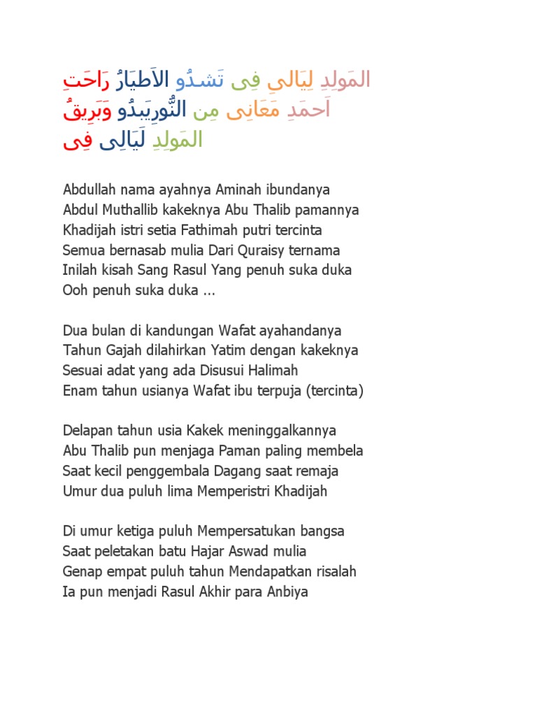 Dua bulan di kandungan Wafat ayahandanya Tahun gajah dilahirkan Yatim dengan kakeknya Sesuai adat yang ada Disusui Halimah Enam tahun usianya Wafat Ibu tercinta yang penuh suka duka yang penuh Suka duka. Instagram Nissa Sabyan Konser. Judul lagu ini dikenal juga dengan Rohatil Athyaru Tasydu.
